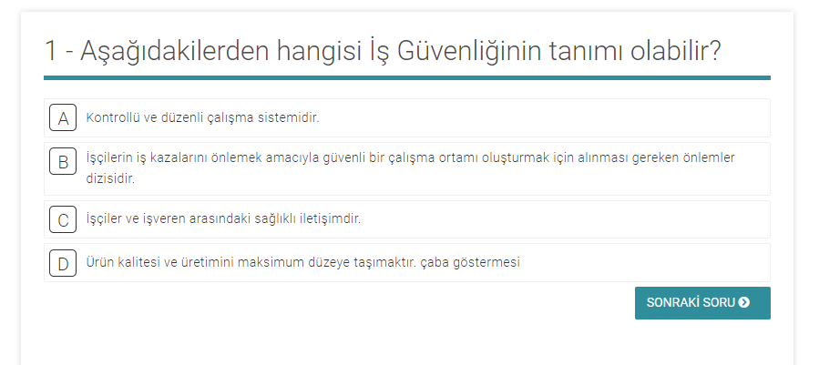 Dersi başlat butonuna tıkladıktan sonra test bölümünde soruları cevapladıktan sonra